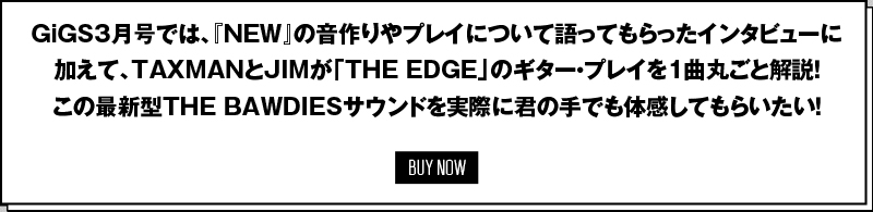 前作『Boys!』から約2年2ヶ月ぶりとなるニュー・アルバム『NEW』。ここには、近年彼らがシングルやライブで漂わせてきた、より高い熱量が溢れんばかりに注入されている。まさに、過去最高にアツくなったTHE BAWDIESサウンドが凝縮されているのだ。今回はそんな1枚が完成を見るまでに、4人が感じ取っていた現在のモード、そしてアルバム制作の舞台裏を聞いた。さらにGiGS本誌では、TAXMANとJIMによる「THE EDGE」のギター奏法解説 & 今作における4人のサウンドメイクについて聞いたインタビューを展開。併せてチェックして、『NEW』のサウンドの最深部に足を踏み入れて欲しい!