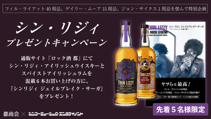 通販サイト「ロック酒 都」にてシン・リジィ・アイリッシュウイスキーとスパイストアイリッシュラムを混載6本お買い上げの方に、書籍『シン・リジィ ジェイルブレイク・サーガ』をプレゼント!