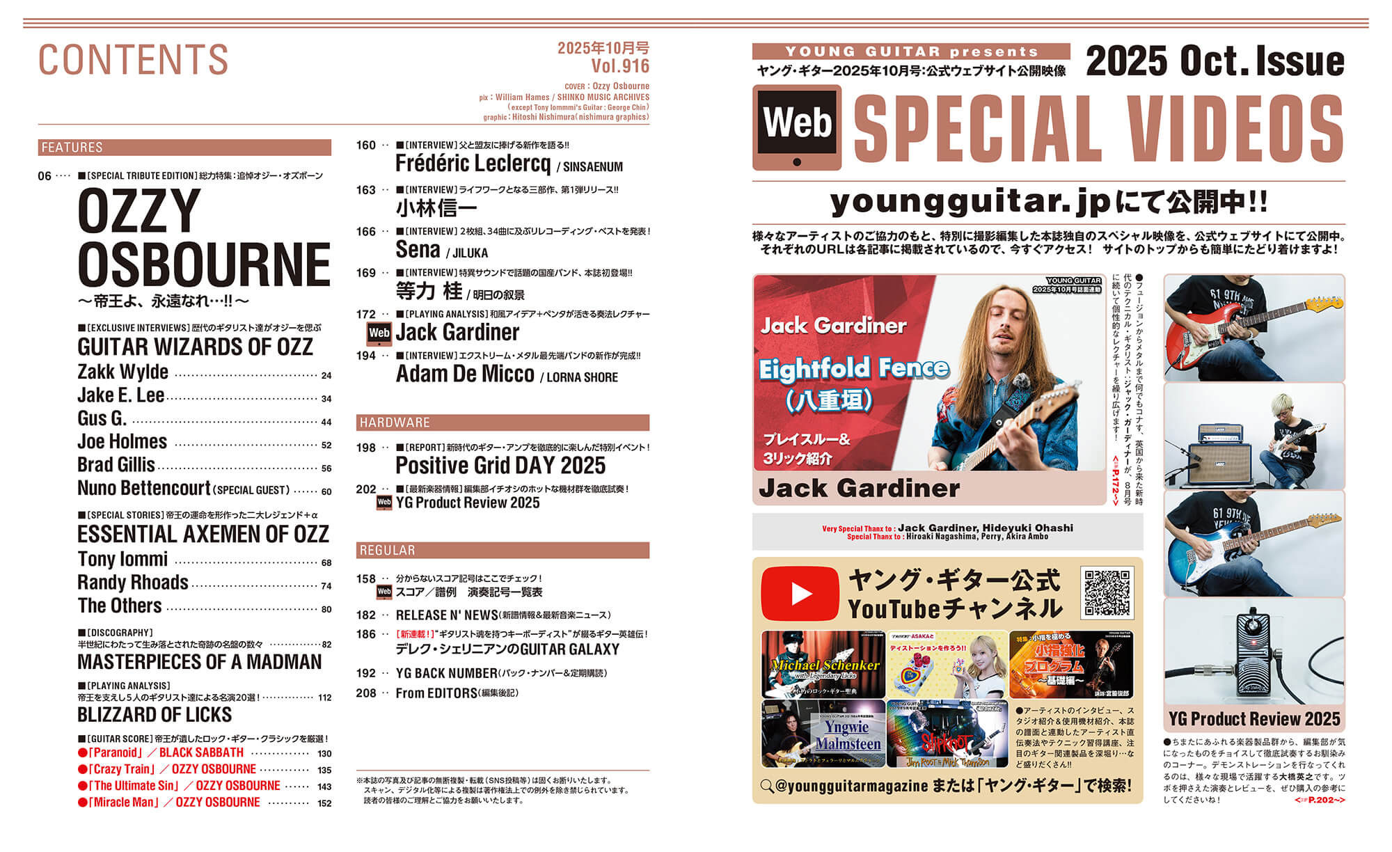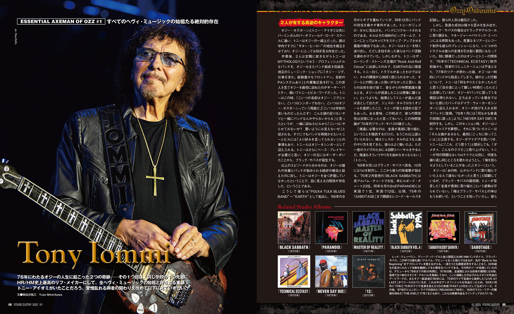ヤング・ギター2025年10月号は、“ヘヴィ・メタル界の帝王”と呼ばれたシンガー:オジー・オズボーン(ブラック・サバス、ソロ)の総力追悼特集を増ページ大ボリュームで掲載。7月5日、最後のライヴと称した一大イベント“Back to the Beginning”を大成功に収めるも、同月下旬に惜しくも逝去──シーンにもたらした多大な功績を振り返ると共に、彼の活動を支えた伝説的ギタリスト達にもフォーカスしていきます。