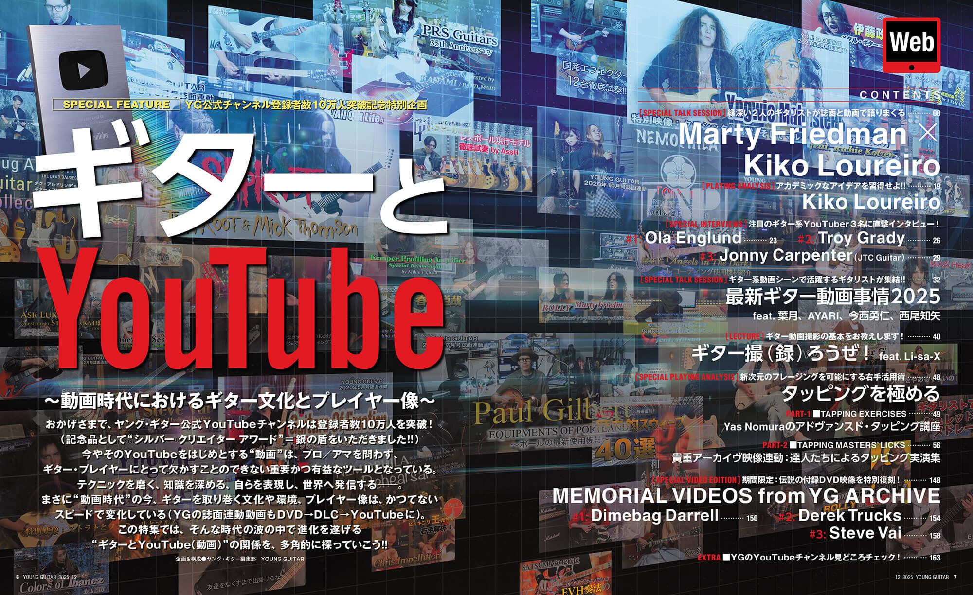 おかげさまで、ヤング・ギター公式YouTubeチャンネルは登録者数10万人を突破!(記念品として“シルバー クリエイター アワード”=銀の盾をいただきました!!)今やそのYouTubeをはじめとする“動画”は、プロ/アマを問わず、ギター・プレイヤーにとって欠かすことのできない重要かつ有益なツールとなっている。テクニックを磨く、知識を深める、自らを表現し、世界へ発信する──。まさに“動画時代”の今、ギターを取り巻く文化や環境、プレイヤー像は、かつてないスピードで変化している(YGの誌面連動動画もDVD→DLC→YouTubeに)。この特集では、そんな時代の波の中で進化を遂げる“ギターとYouTube(動画)”の関係を、多角的に探っていこう!!