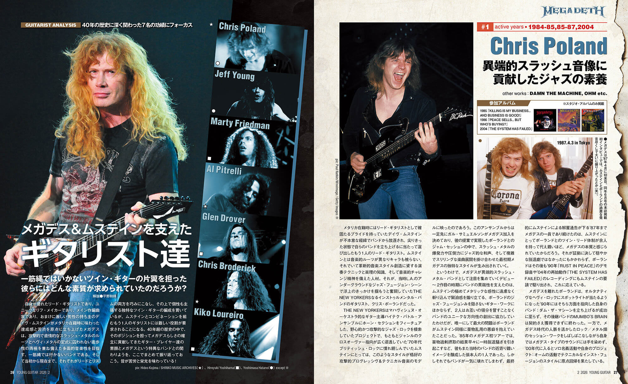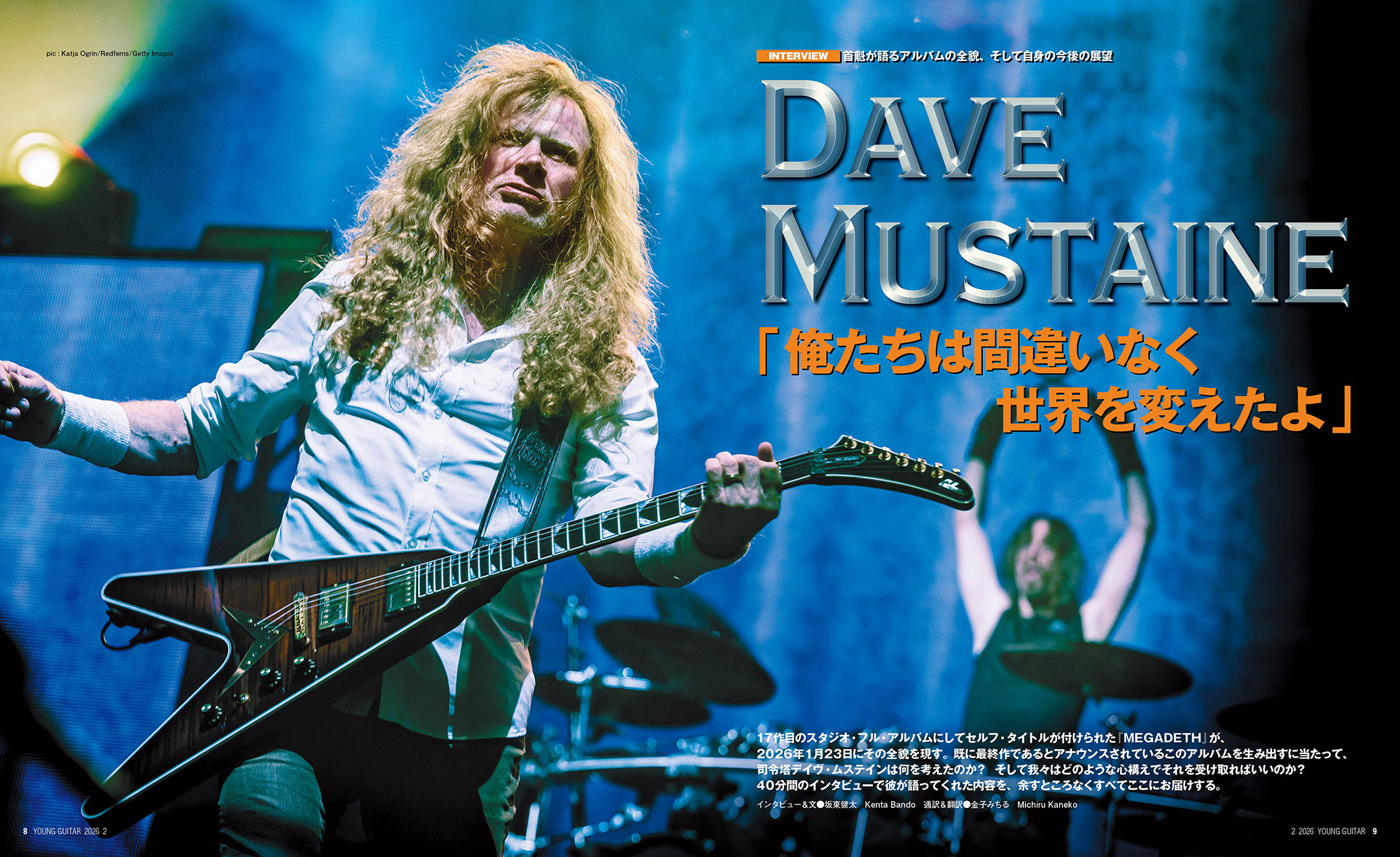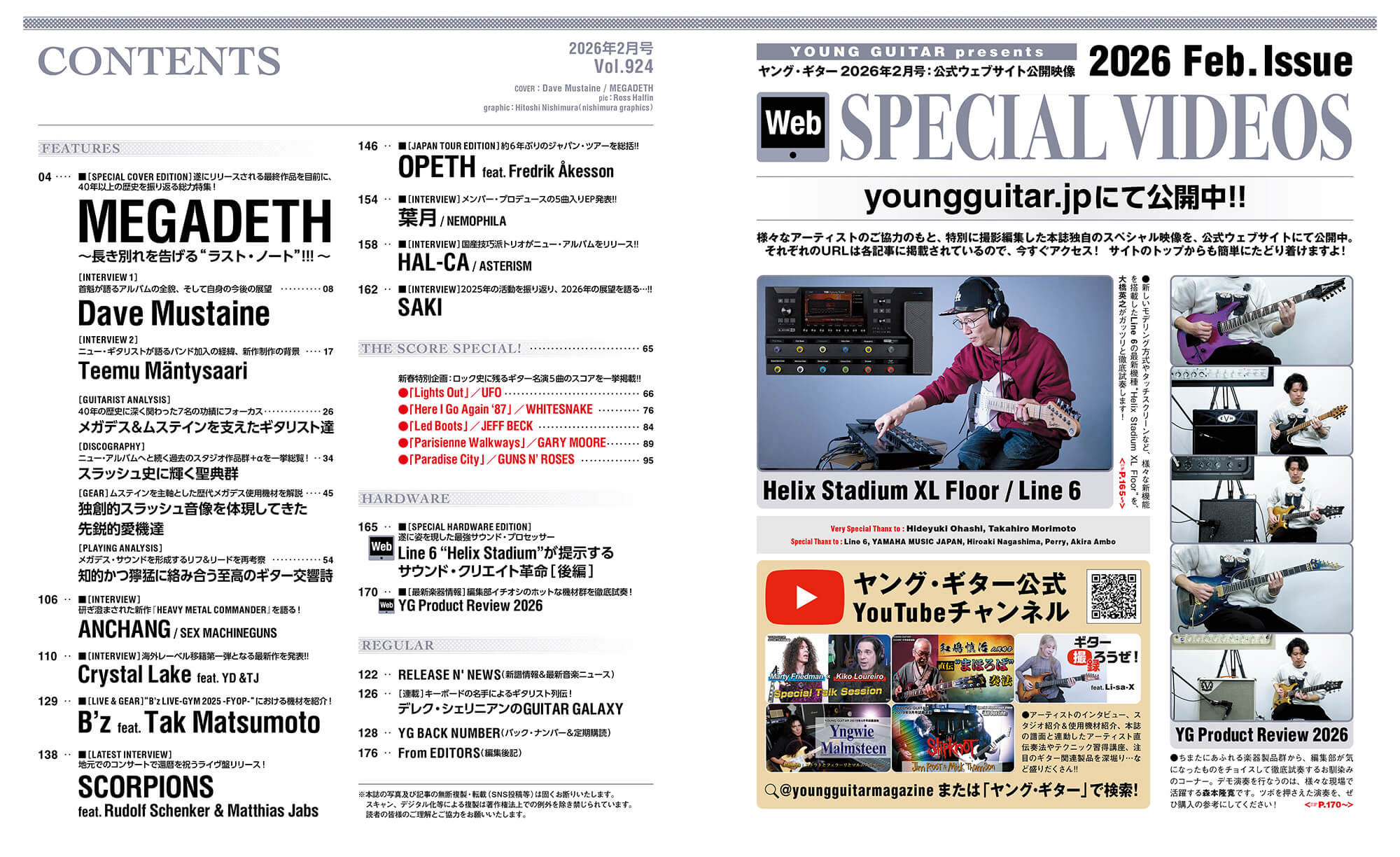 表紙巻頭特集は、まもなく最終作品となるセルフ・タイトル・アルバム『MEGADETH』をリリースするメガデス。リーダー:デイヴ・ムステイン&新ギタリスト:テーム・マントゥサーリの最新インタビューを中心に、新作の全貌に迫りつつ、過去にムステインを支えた歴代ギタリスト達の分析や使用機材、ディスコグラフィ、メガデス奏法などをお届け。